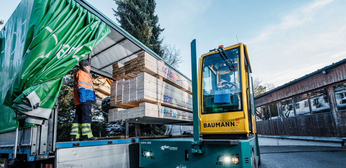 In enger Zusammenarbeit mit Rundholzfuhrunternehmungen verbessern wir laufend unsere Logistik. Damit wir Leerfahrten vermeiden können, laden die Chauffeure auf dem Rückweg von Auslieferungen jeweils vom Forst bereitgestelltes Rundholz auf. Dadurch gewinnen wir Zeit, schonen die Umwelt und haben einen steten Zufluss von hochwertigem Rohstoff.